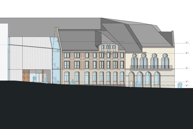 Die bestehende Baulücke an der Hochstättenstraße wird zur Ergänzung der innerstädtischen Großform (Blockrandbebauung) geschlossen. Die Aufnahme der Traufkanten vermittelt zwischen Bestand und Neubau, eine vollständige Unterkellerung wird im Zuge des Umbaus vorgenommen. Der Neubau nimmt das Foyer des Stadtmuseums auf, und steht durch seine unmittelbare Nähe im Dialog mit der Mauritiusbibliothek. Die Umgestaltung des Straßenraums wird angestrebt.