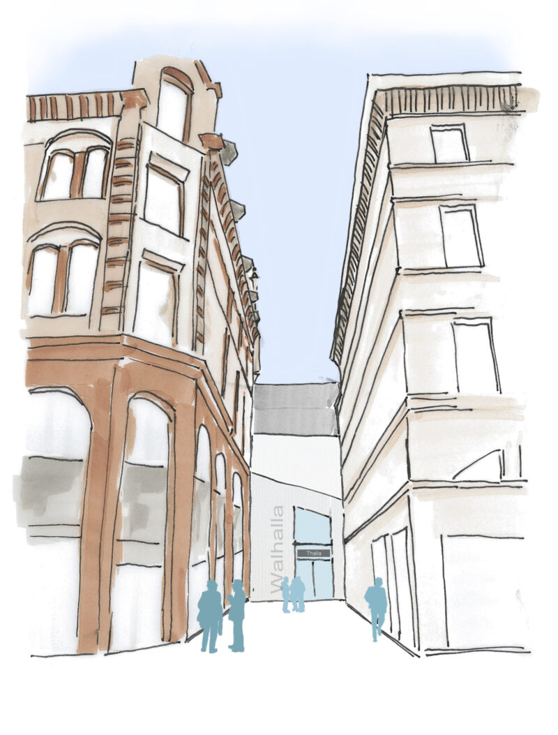Die Neuordnung in Richtung Kirchgasse sieht den Rückbau der unterschiedlichen Anbauten und Geschossigkeiten unter Beibehaltung des Zugangs zum Thalia-Kino vor. Die Zugangssituation wird aufgewertet und erhält ein neues Gesicht zum städtischen Raum, was einen Gewinn für Walhalla, Thalia-Kino und die Fußgängerzone darstellt. Analog der Gestaltung in der Hochstättenstraße wird hier ein Wiedererkennungswert in stark frequentierter Lage geschaffen.